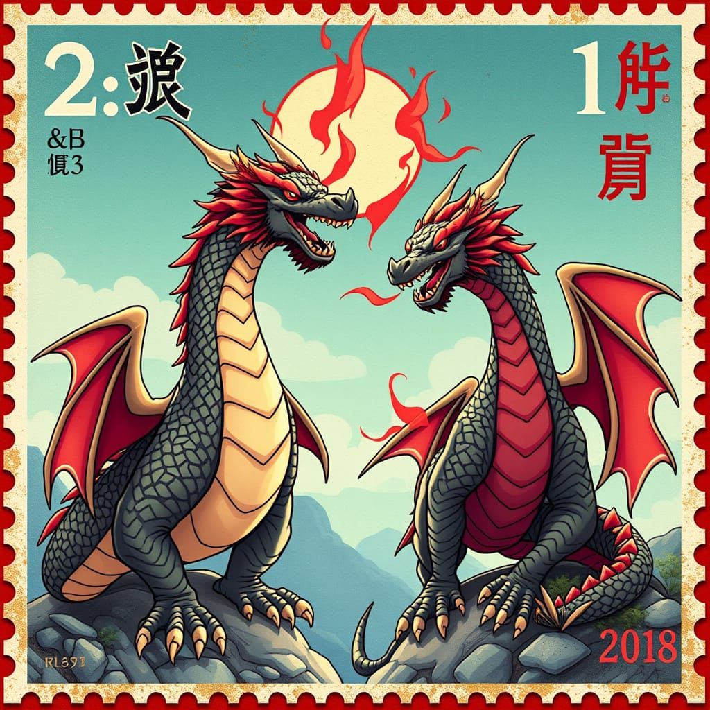 This image shows vintage postage stamps featuring majestic dragons with flame red accents. The anime-inspired illustration has a vibrant style reminiscent of Japanese animation studios.