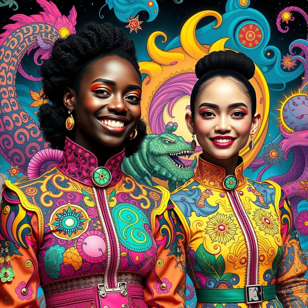 This image shows two women in futuristic streetwear in a surreal, colorful world. The women wear intricate vegan outfits with neon accents against a backdrop of swirling patterns and fantastical creatures, rendered in a photo-realistic style.