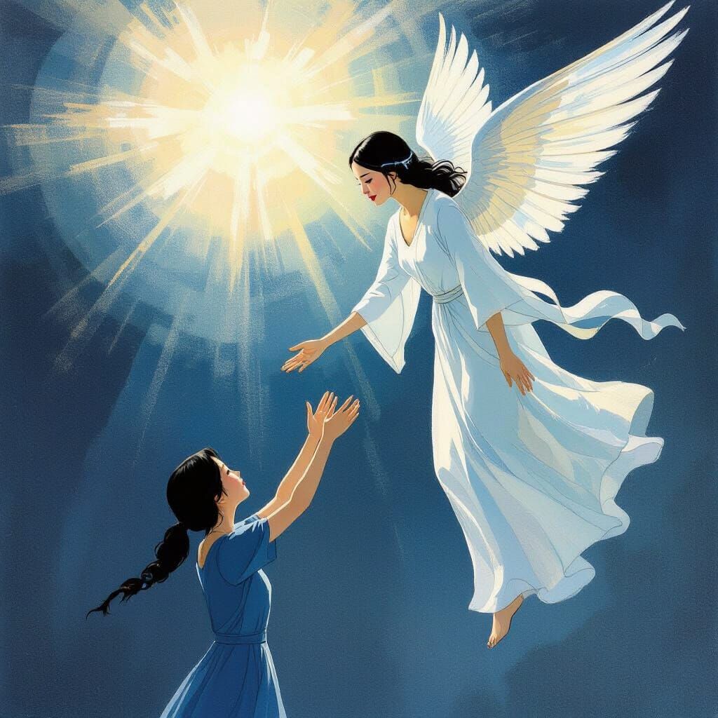 This image depicts an angel descending from a bright sky to a Chinese woman reaching up. Rendered in a vibrant, textured oil pastel style with bold strokes and soft blending.