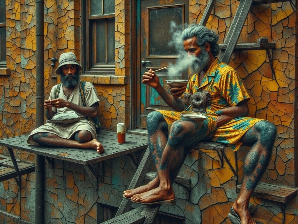 A man in his forties enjoys a meal on a Chinatown fire escape. The scene captures urban realism with a cracked texture effect, inspired by acclaimed artists.