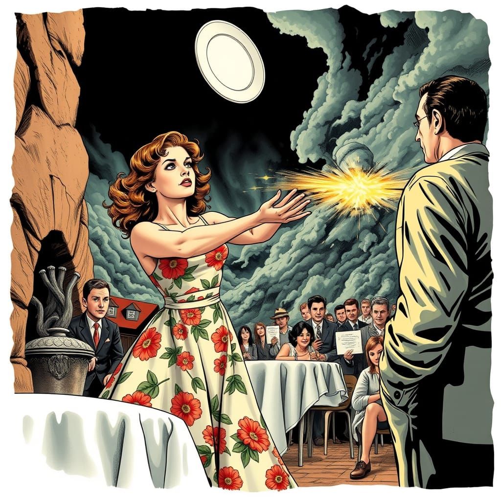 A dynamic image of a woman in a floral dress throwing a plate at a man. The artwork is rendered with exaggerated realism and bold lines, reminiscent of regionalist and comic book art.