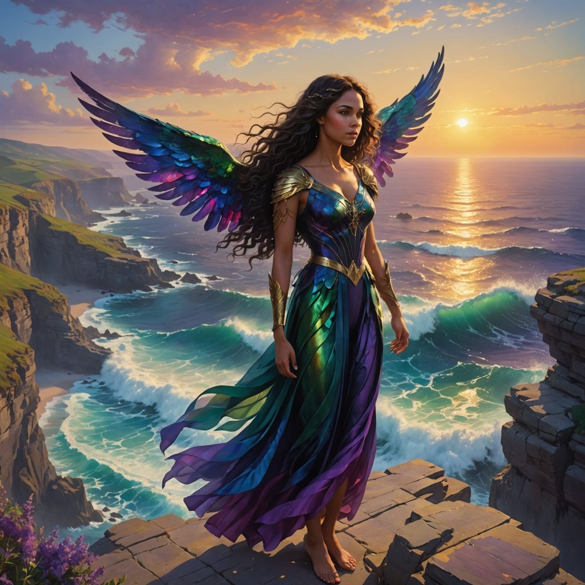 This image shows a winged woman standing on a cliff overlooking the ocean. She is wearing a flowing gown and appears determined as she gazes towards the horizon.