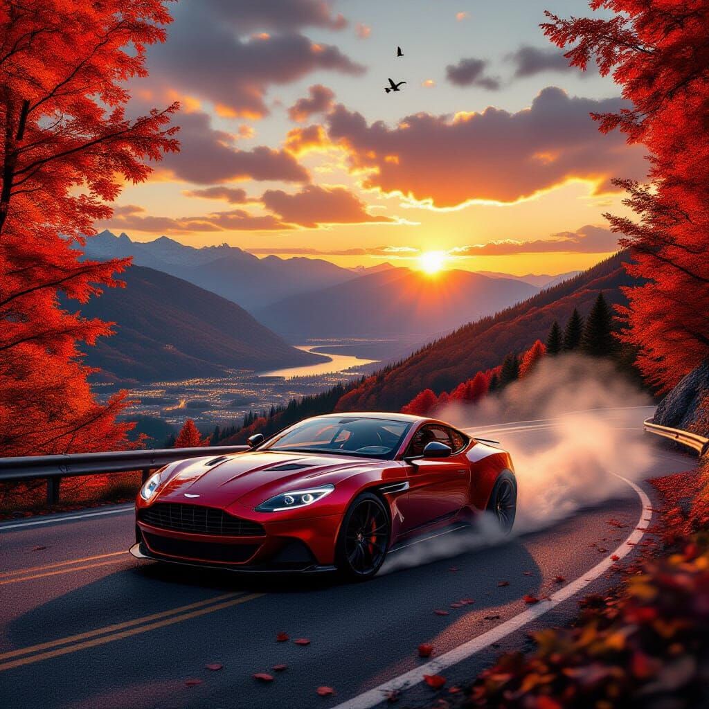 This image captures a crimson Aston Martin sports car in a dramatic drift on a winding mountain road. Autumn leaves fall as a vibrant sunset paints the sky. Photorealistic cinematic style with motion blur and lens flare.