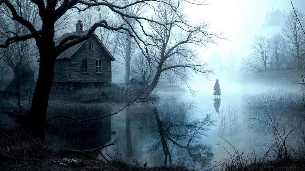 This image shows a misty lake scene with an old house in the distance. The scene evokes a bleak, haunting, and mystical atmosphere with the shadow of an old lady.
