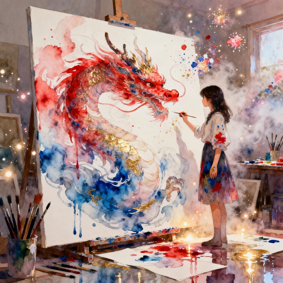 This soft watercolor image depicts a female artist in her studio as a Chinese dragon emerges from her painting, swirling with mist and vibrant colors.