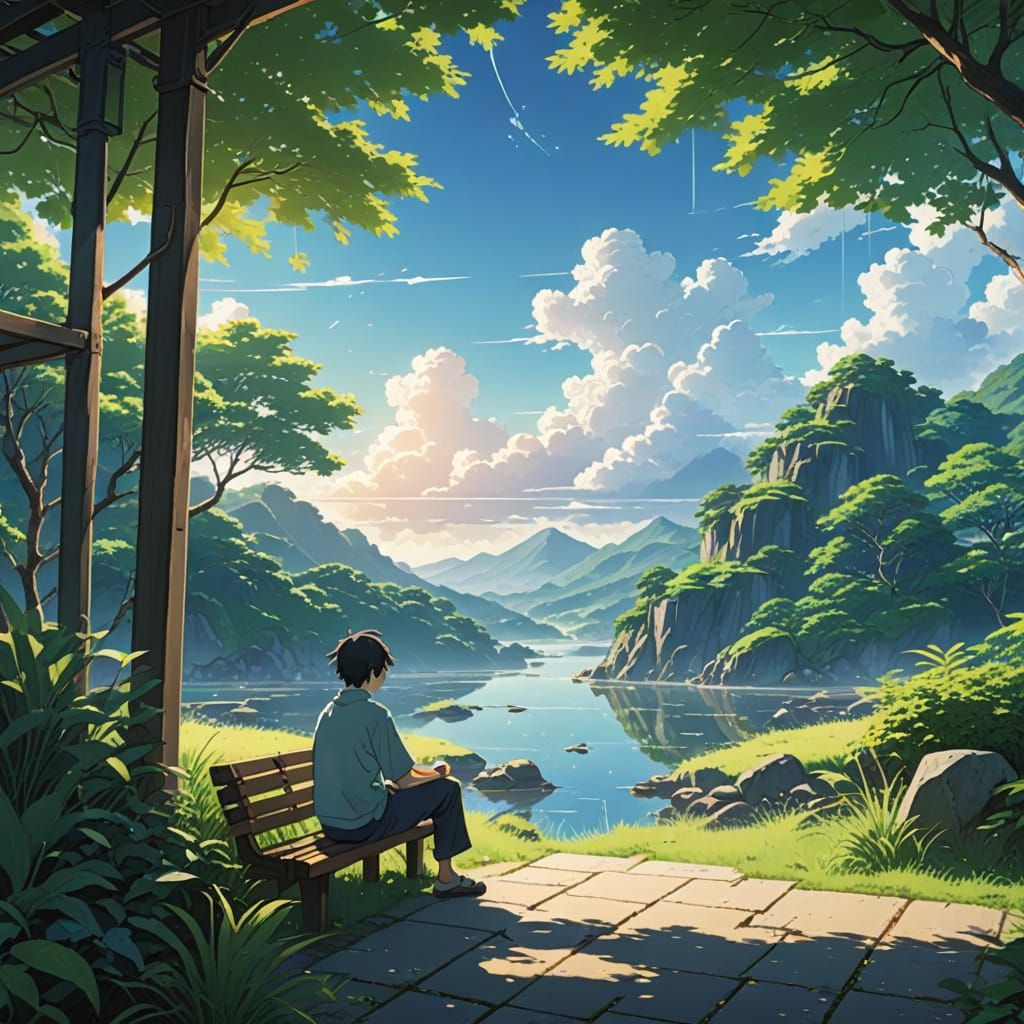 This anime key visual showcases a person relaxing in a serene natural setting. Experience a peaceful mood with vibrant colors and intricate details, rendered with soft natural lighting.