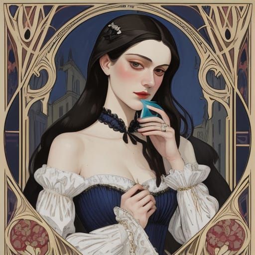 This Art Nouveau illustration depicts a comedic scene of a foolish vampire attempting to drink from mannequins, rendered with delicate brushstrokes and bold outlines.