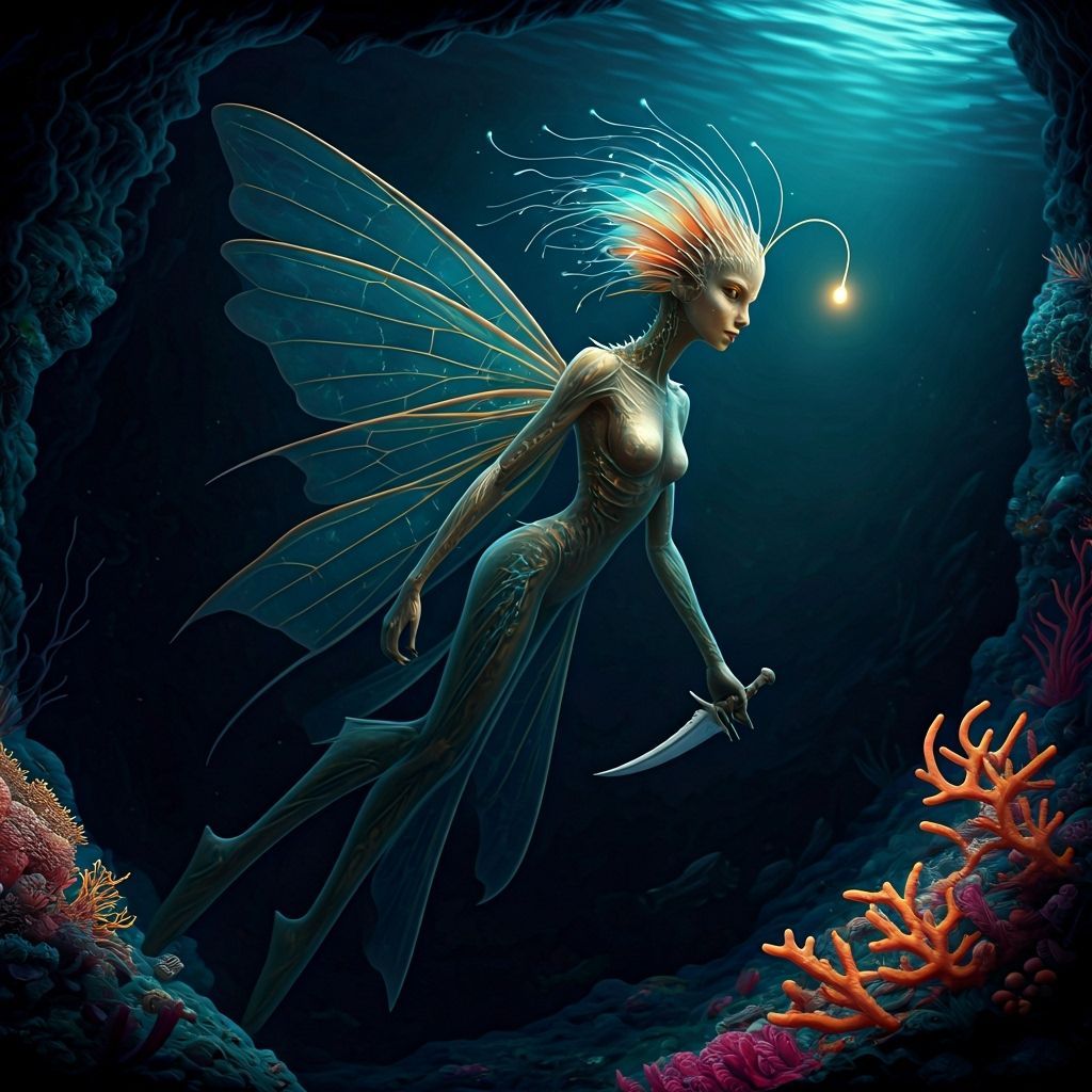 This image shows a bioluminescent fairy adapted to a deep-sea environment. With jellyfish-like wings and anglerfish-inspired antennae, it navigates dark currents while hunting with a shark tooth dagger, in an alien oceanography style.