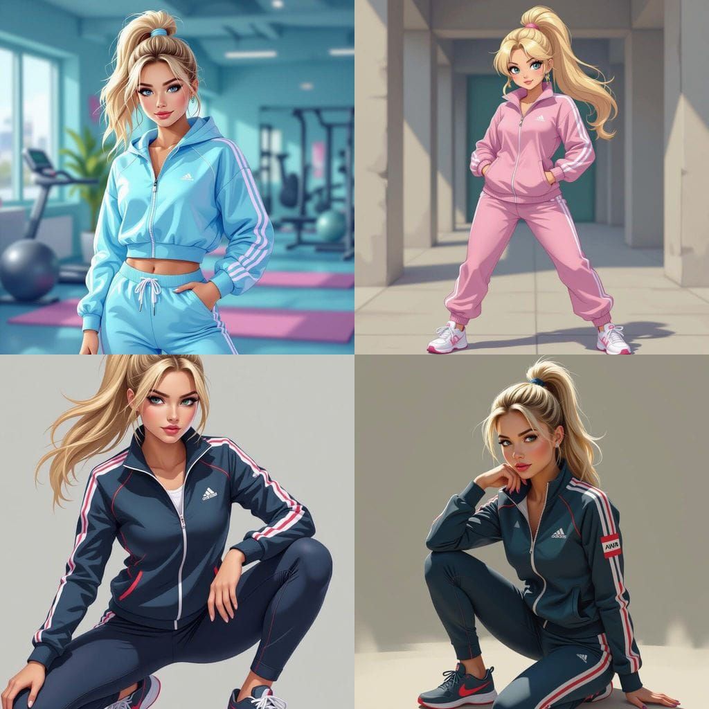 This image shows a blonde Russian girl with a ponytail wearing a tracksuit. The AI generated image is of a cute girl in sportswear.