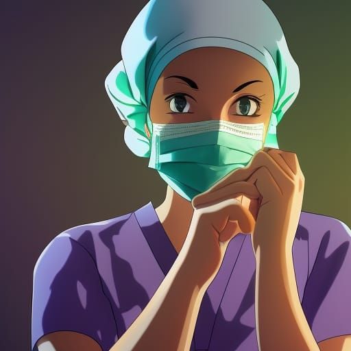 A digital anime illustration of a surgical nurse preparing for a procedure. The nurse has bright green eyes and is wearing purple surgical scrubs. The image is reminiscent of Studio Ghibli.