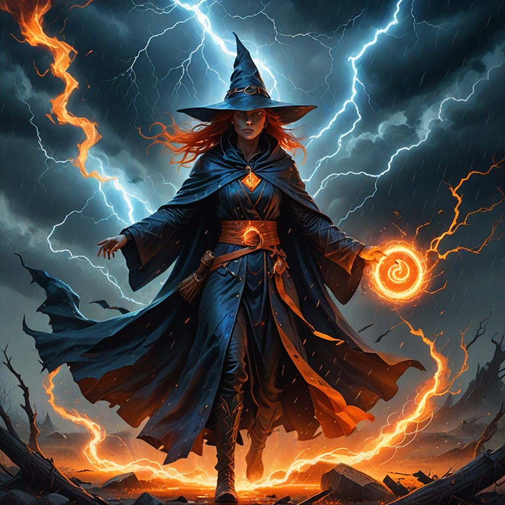 This digital painting depicts a powerful witch in a dramatic storm, illuminated by lightning. Fiery runes glow on the ground, creating an ethereal and mystical scene with vivid blues and oranges.