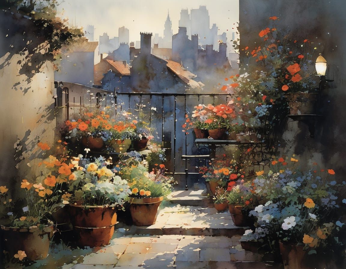 This image depicts a young girl's delight with vibrant flower pots in a dimly lit urban backyard. The art style is intricate and detailed, reminiscent of watercolor techniques.
