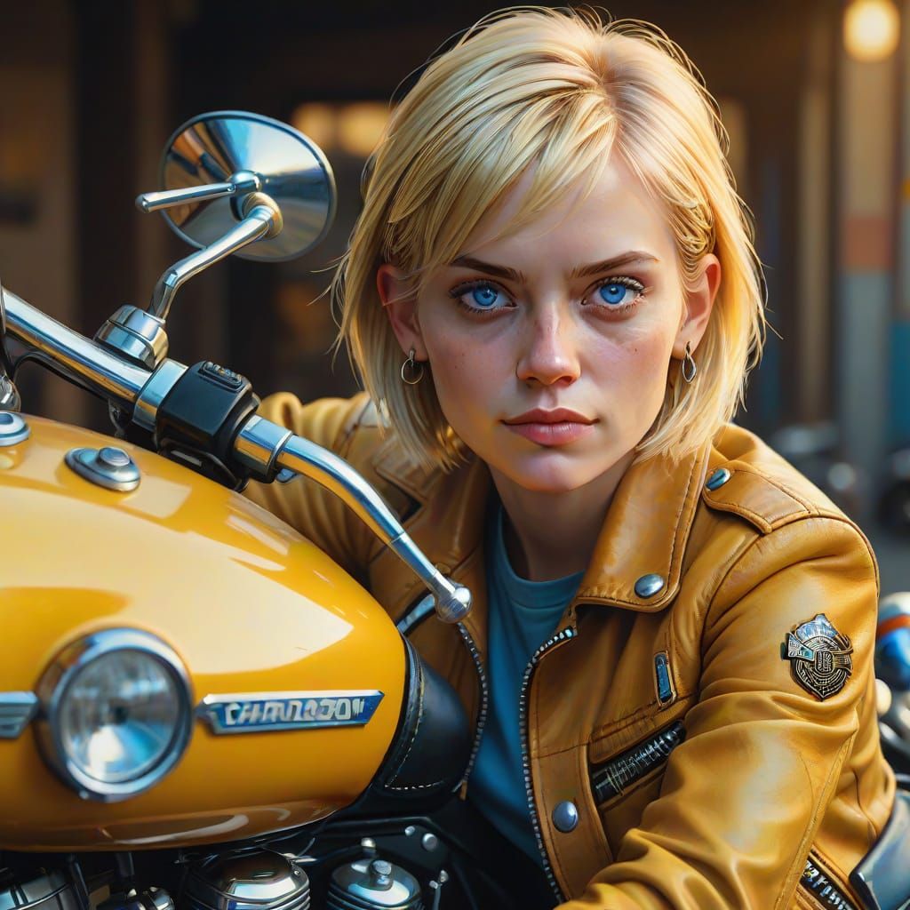 This image shows a striking, close-up portrait of a blonde woman with blue eyes on a yellow Harley Davidson. The artwork is rendered as a hyperrealistic, detailed oil painting with warm lighting and deep shadows.