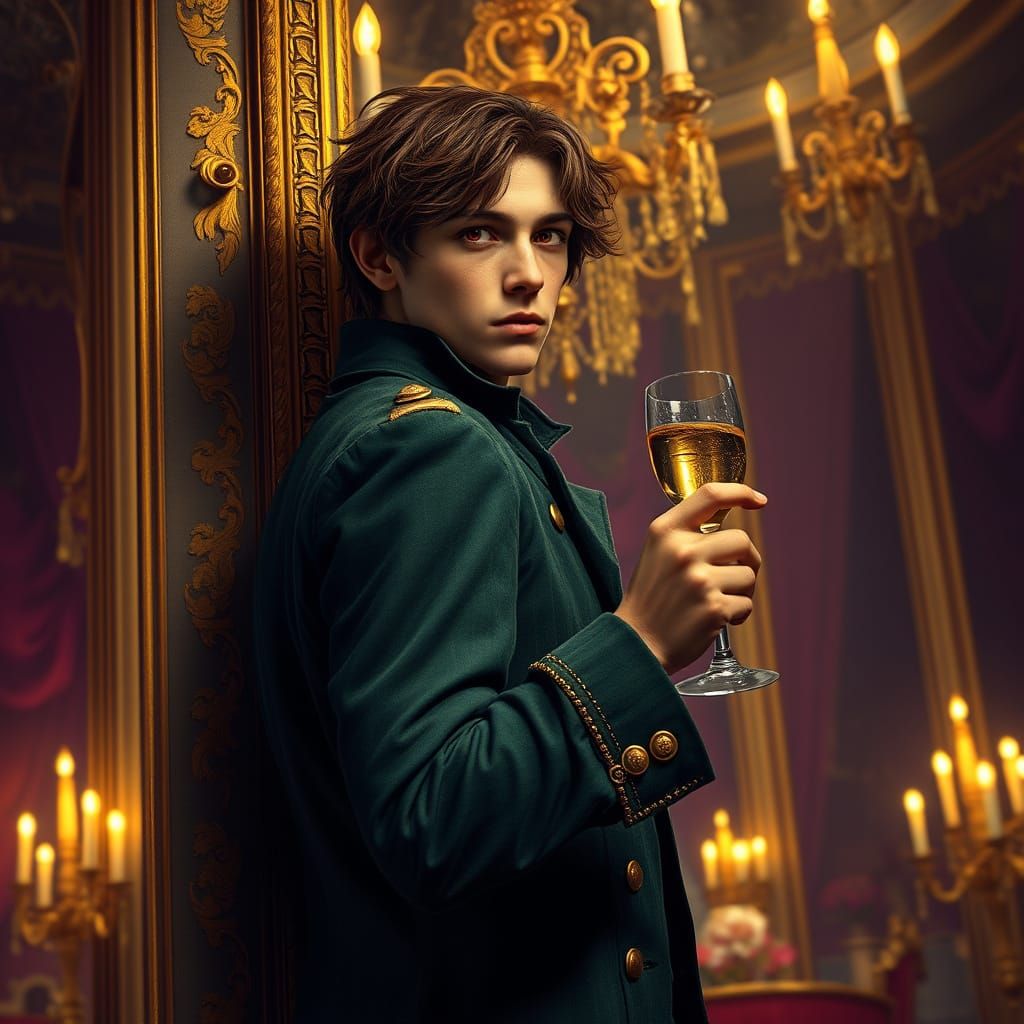 A young man with piercing red eyes stands against a gilded wall, clad in a worn, forest green Revolutionary War coat, lost in thought as a grand ball unfolds in the background.