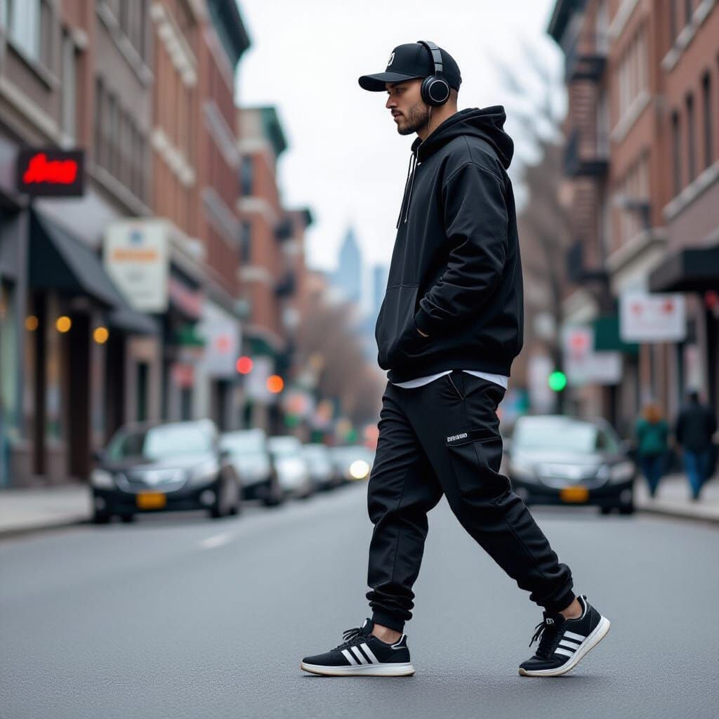 This image shows a young man with headphones walking down an urban street. He's wearing Adidas clothing and shoes in this AI generated image of a modern hip-hop artist.