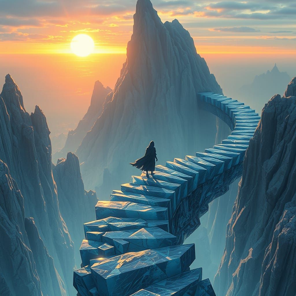 A lone figure stands on a spiraling crystal bridge as reality shatters around them. Impossible colors ripple through the air in this surreal cosmic fantasy landscape rendered with ultra-realistic textures.