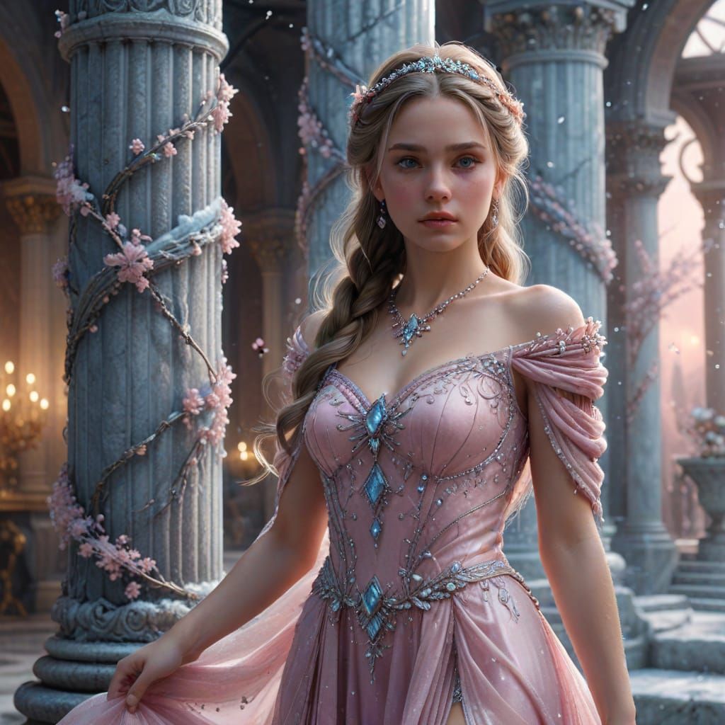 A hyper-realistic digital matte painting of a magical princess with braided hair in an ice-pink gown. Features cinematic lighting, shimmering snow accents, and grand marble columns within a fantasy palace.