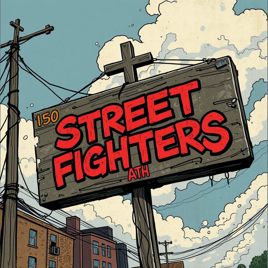 This image shows a vintage sign with graffiti-style lettering reading "150 STREET FIGHTERS ATH," set against an urban backdrop. An orthodox cross adds contrast in this old school animation style artwork.