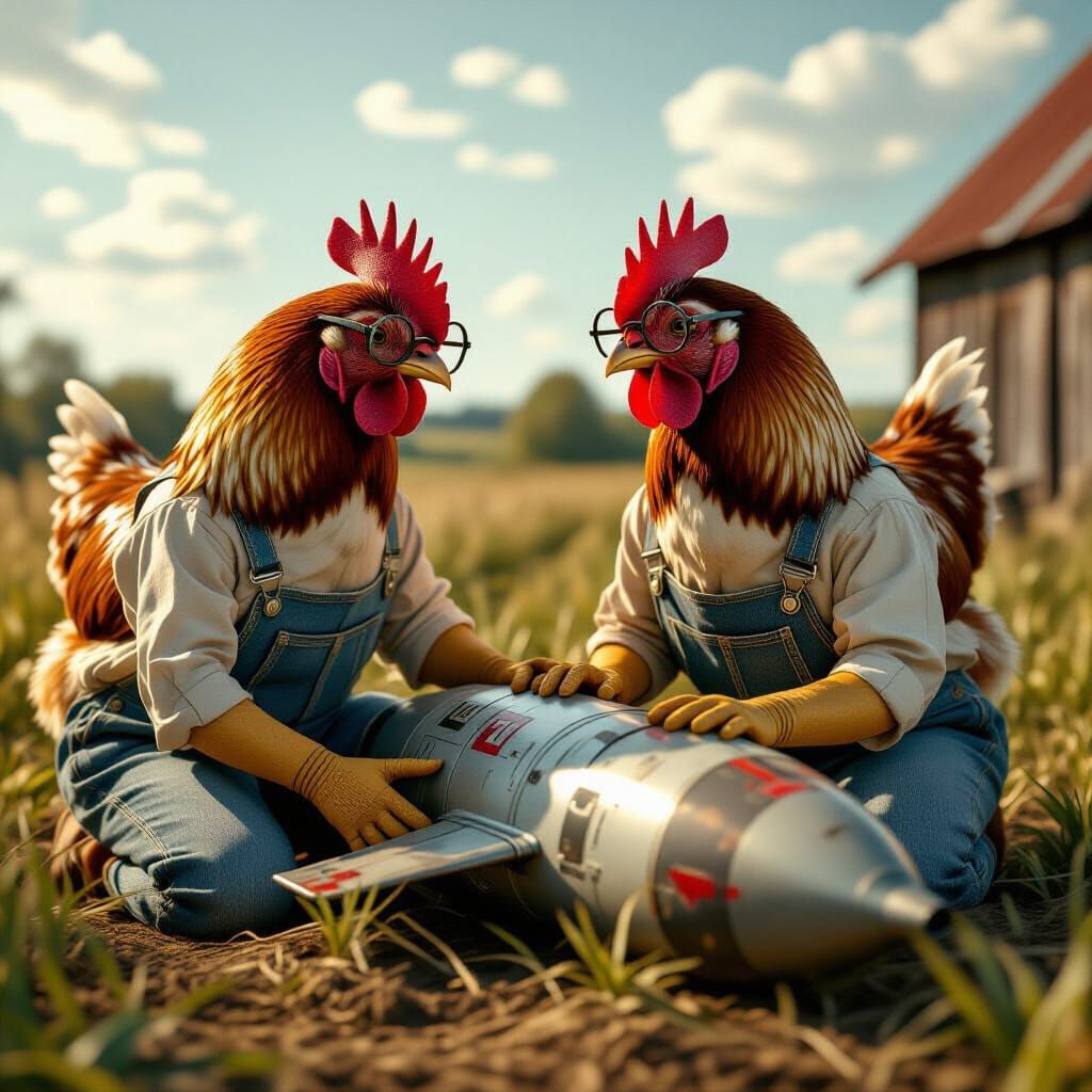 This image shows hens dressed in overalls examining a crashed rocket on a farm. The picture is in sepia tones with a grainy texture, reminiscent of 1940s photography.
