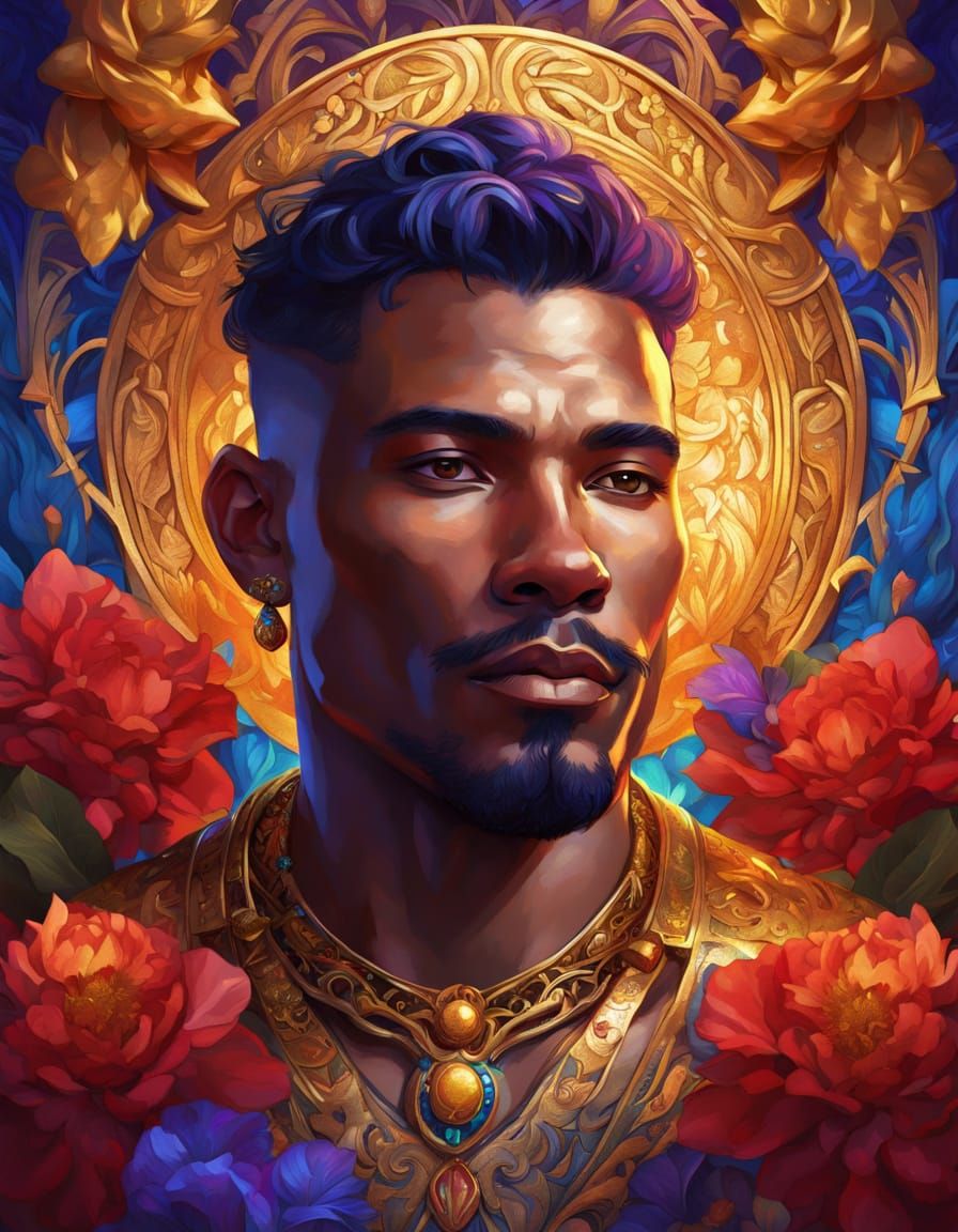 A digital painting of a serene, muscular man with golden skin, wearing ornate gold and jeweled accessories. The artwork features vibrant colors, detailed textures, and dramatic lighting, inspired by Art Nouveau.