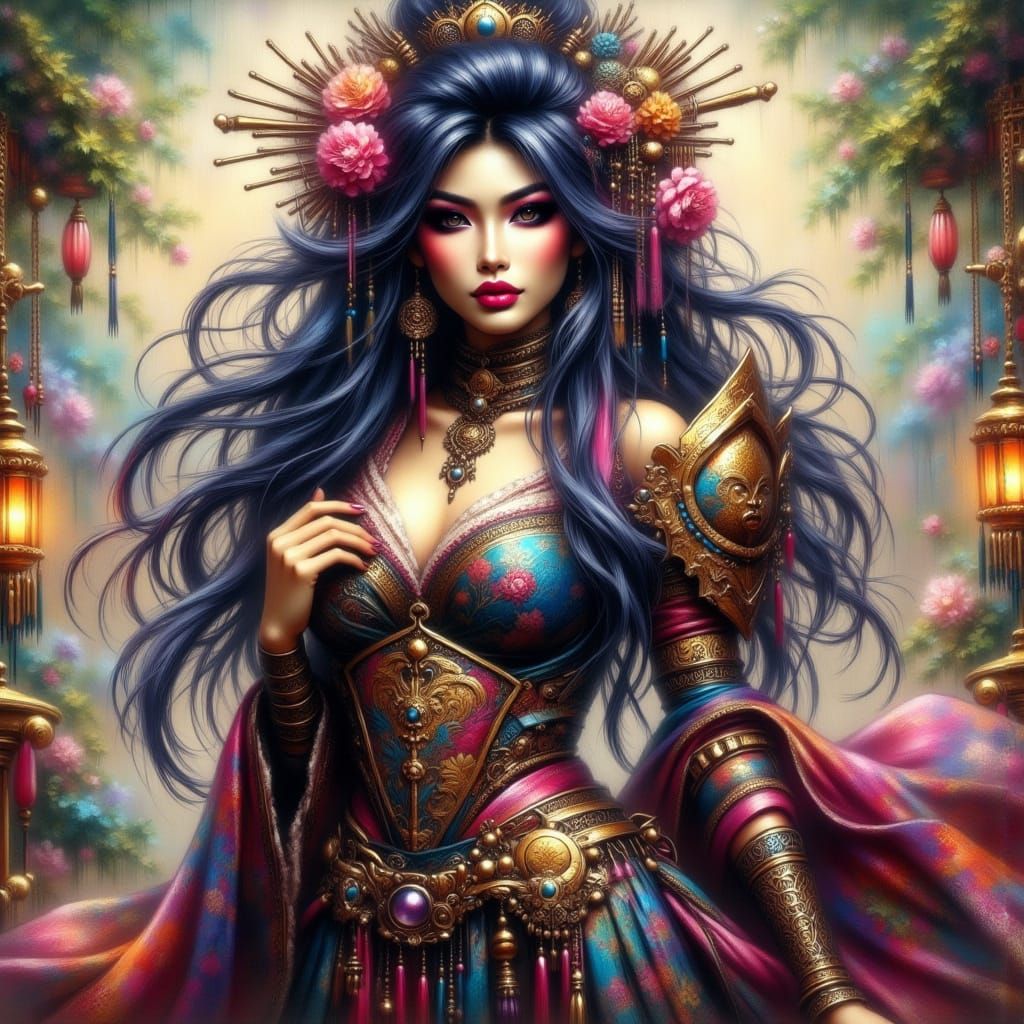 A striking picture of a woman in elaborate armor. The image blends 3D anime aesthetics with concept art precision, using dynamic lighting and triadic colors for a hyperdetailed digital painting.