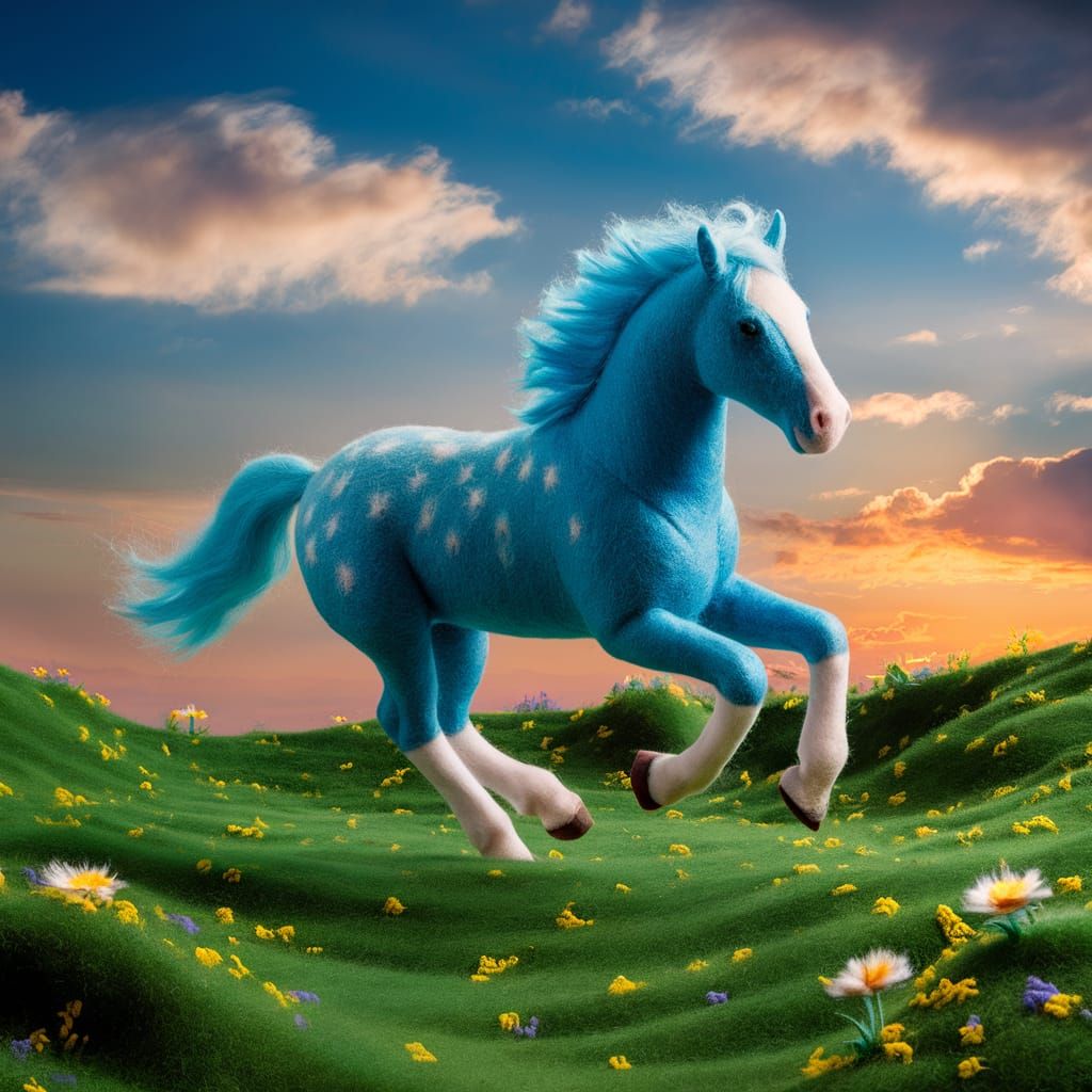 This image shows a celestial blue felt horse galloping through a lush green felt meadow filled with flowers, set against a vibrant sunset sky. The scene evokes a dreamlike serenity.