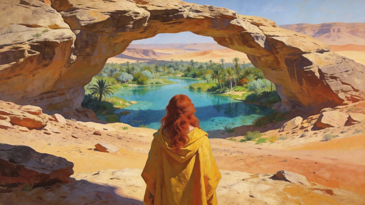 This image shows a woman in a yellow cloak standing before a massive stone arch in a desolate desert. Beyond the arch lies a lush oasis, a stark contrast to the barren surroundings.