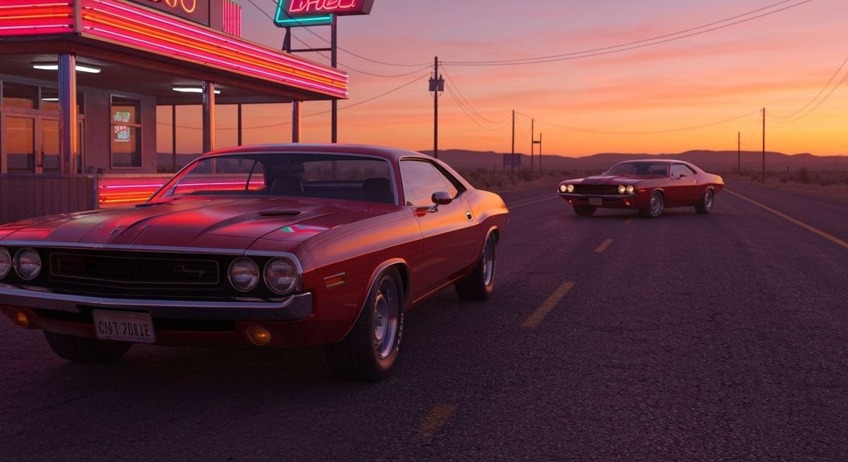 This image features a crimson 1970 Dodge Challenger parked at a neon diner during a vibrant desert sunset. Another car speeds away on a dusty road. Photorealistic, cinematic lighting.