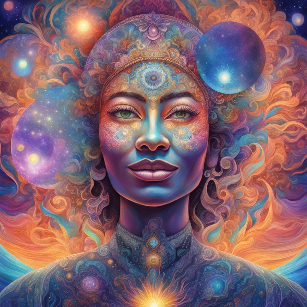 This image shows a close-up cosmic digital painting of a smiling person. Full moons are reflected in their eyes, love emanates from them, and soft light illuminates the scene in vibrant pastel hues.