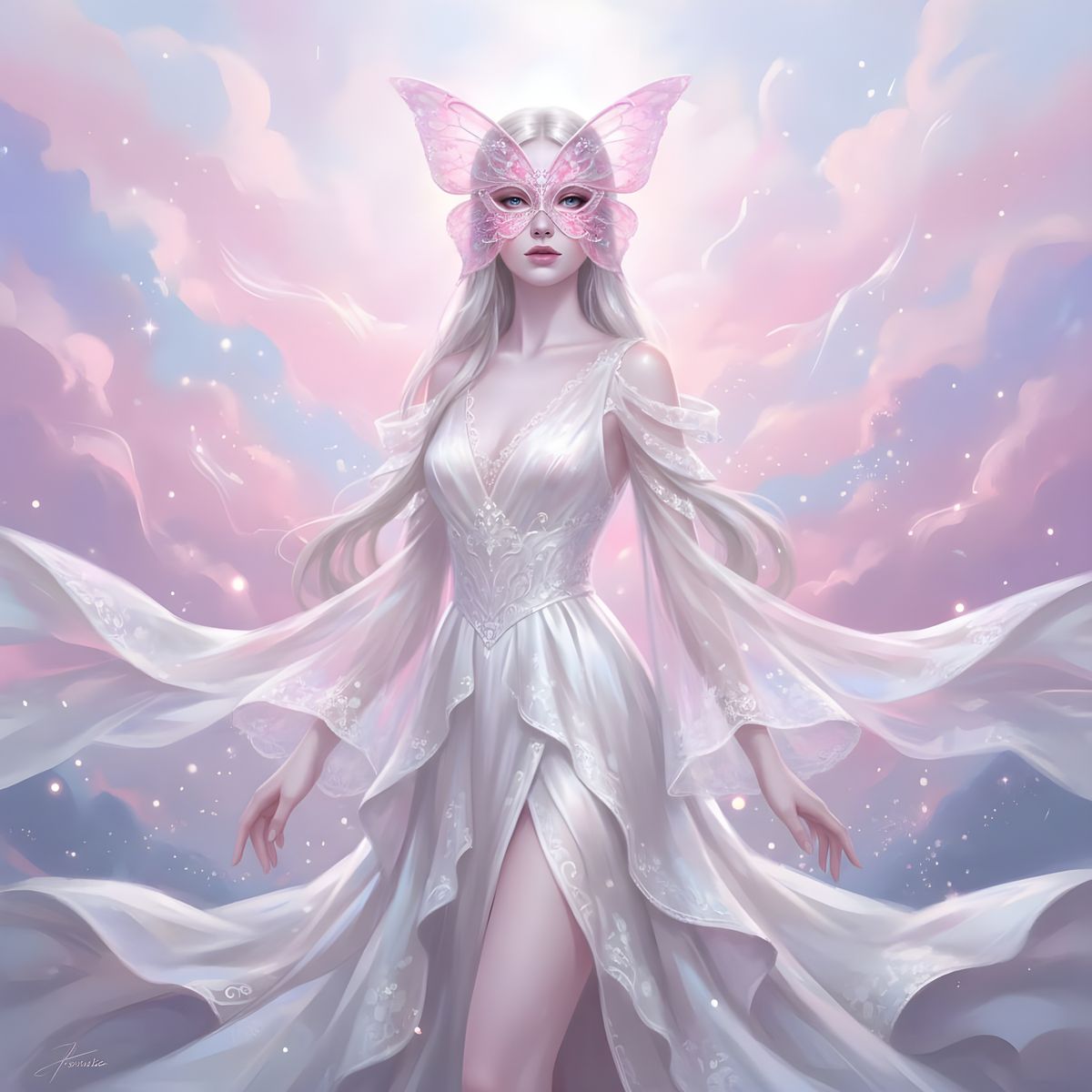 This hyper-realistic photograph features a woman wearing a delicate pink butterfly mask, showcasing porcelain skin and a soft pastel color palette.