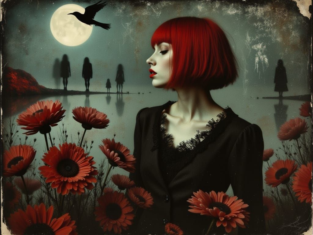 This image depicts a delicate young Gothic woman with red hair in a surreal, moonlit circus fashion. The style is dark, ethereal, and features oversized blooms in a gothic carnival aesthetic.