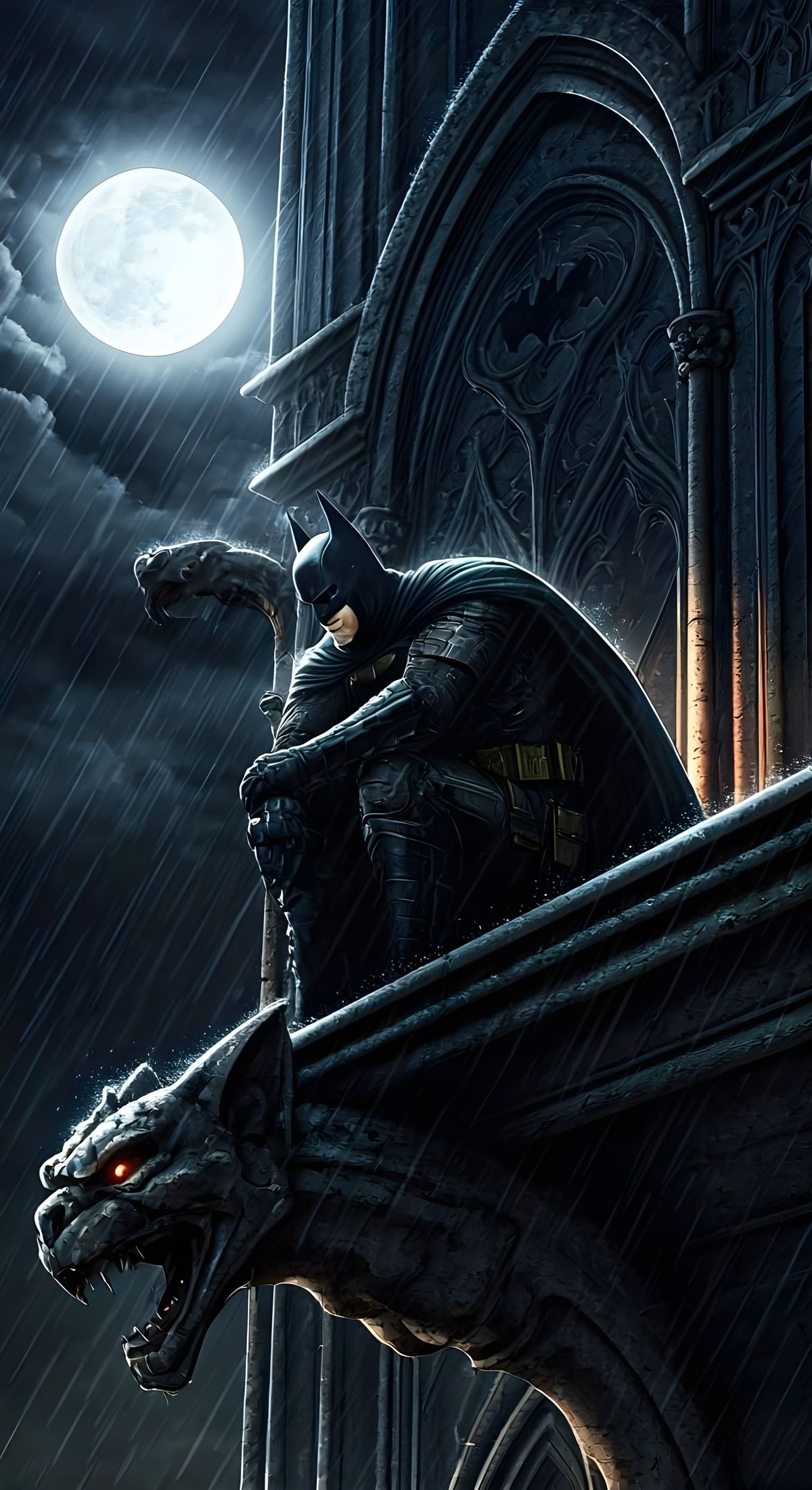 A knight resembling Batman kneels on a cathedral gargoyle. The scene is set on a stormy night, with a full moon illuminating intricate gothic architecture in a hyper-detailed, biomechanical style.