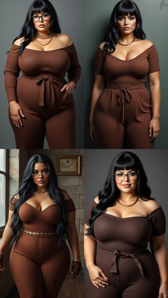 This image features a happy, thick and curvy lab technician in her mid-twenties, wearing a brown off-the-shoulder jumpsuit and glasses. Detailed matte painting style with complementary colors.