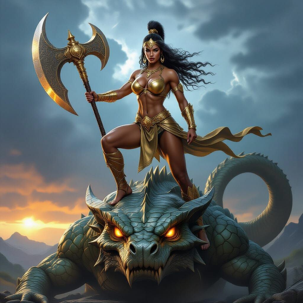 A photorealistic fantasy scene depicts a powerful, bronze-skinned warrior woman standing atop a massive, serpentine beast whose scales merge seamlessly with mossy, jagged terrain. Her physique is muscular and athletic, with broad shoulders, a defined core, and sculpted legs, exuding raw strength and ...