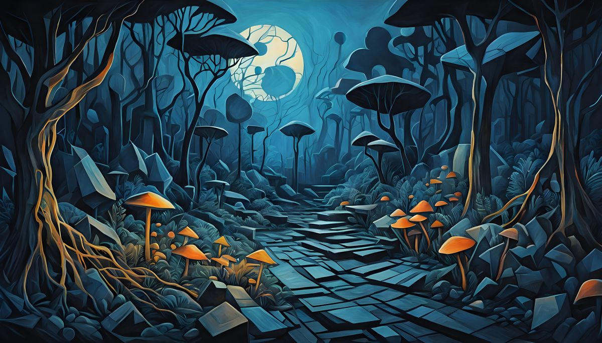a highly detailed creepy garden at night with strange abstract cubist shapes, a creepy ground mist covers the ground, in the style of Zdzislaw Beksinksi, the signature of " Gordon Freeman " i the bottom right corner, ...............