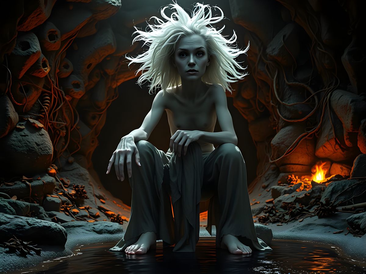 Full portrait. Exquisitely 3D rendered image. Cinema 4D. UltraHD. 64k. Triadic color contrast. Chiaroscuro. Masterpiece. Dynamic lighting. Elden ring viedogame aesthetics. Dungeon 3D background. High relief hole. Vines. Bonfire. Water puddles. Decadent, decrepit, rotten. Rusty. Pale Caucasian woman dressed in rags. Crazy flowing white hair. Crazy red eyes surrounded by dark circles. Barefoot. Dynamic pose. Photorealistic. Yoshitaka Amano. Detailed. Dark horror.
