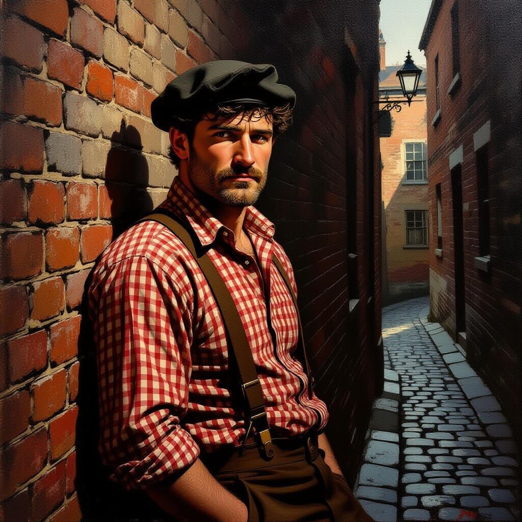 This image shows a man in a vintage military cap and checkered shirt leaning on a brick wall. Rendered in a dramatic, realistic oil painting style, it features moody lighting and urban melancholy.