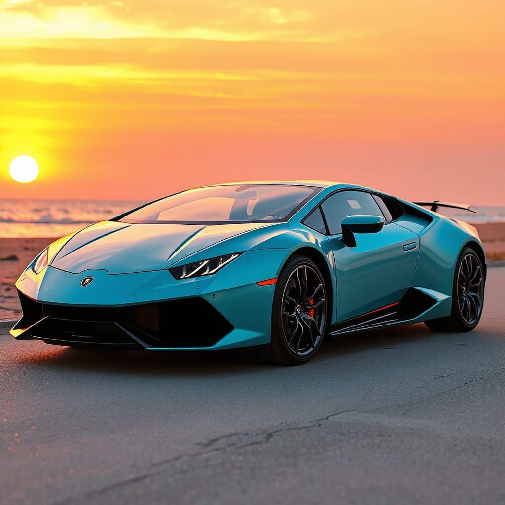 A photorealistic image showcasing a turquoise Lamborghini parked on a beach at sunset. The warm light reflects off the car's metallic surface, reminiscent of automotive photography with crisp textures.