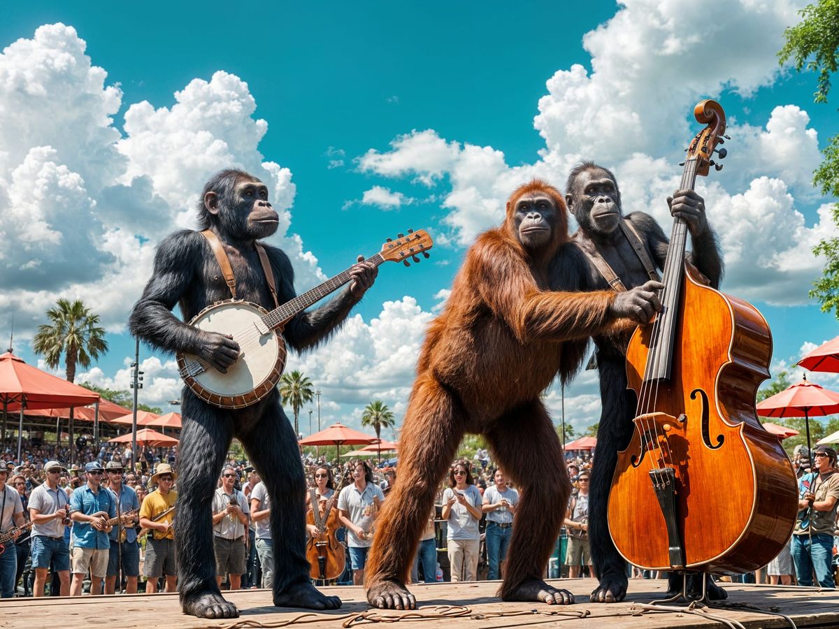 A 3-piece bluegrass band on a stage at a gigantic outdoor concert. The band consists of: Chimpanzee playing 5-string banjo; Gorilla playing an acoustic guitar. A Orangutan playing an upright bass. Sunny day with big fluffy clouds here and there.