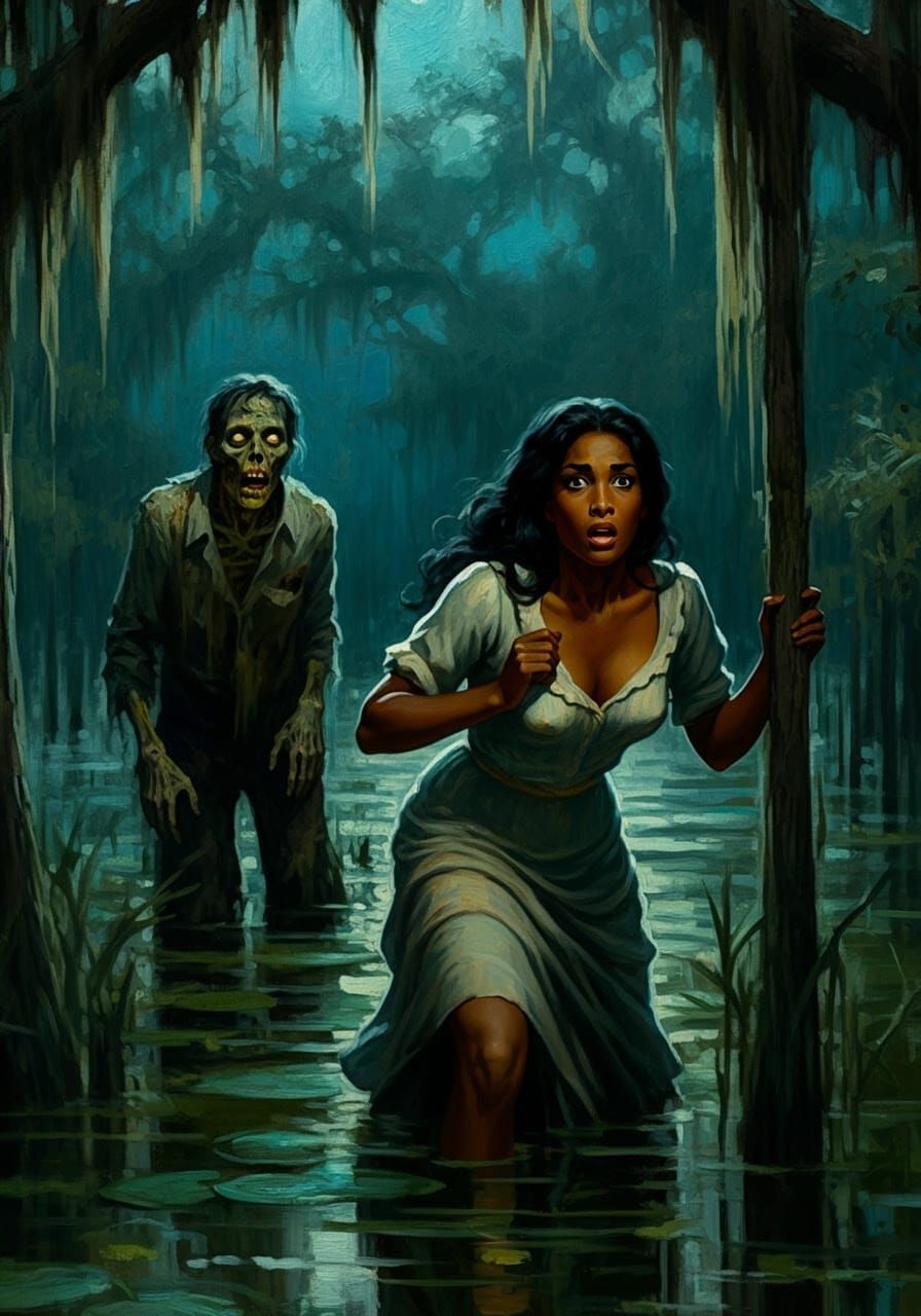 A dark and haunting oil painting of a Cajun woman fleeing a zombie in a spooky swamp at night, created in the style of Edward Hopper's impressionism