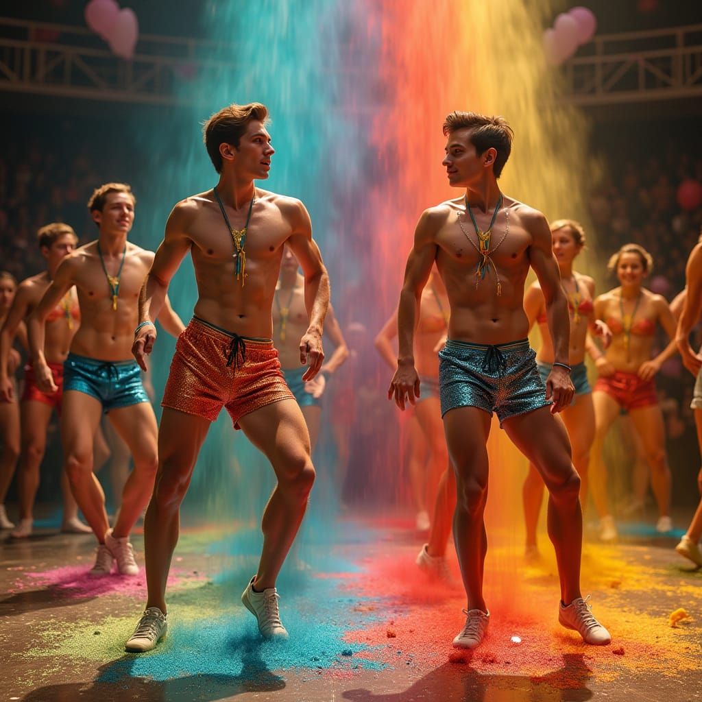 This image shows energetic dancers in sequined costumes performing a Broadway-style musical number. Smeared rainbow colors create a whimsical, art nouveau atmosphere.