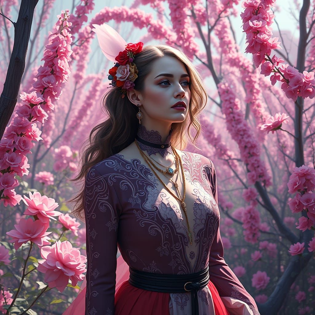 A digital painting of a woman in an elaborate outfit, set in a colorful and detailed environment. The artwork blends conceptual art with a vibrant digital aesthetic.