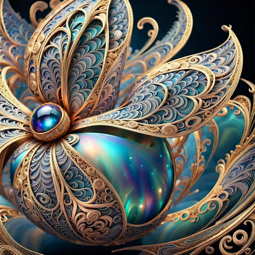A breathtaking image of a star burning in the sky. The artwork features insanely detailed filigree work with pearlescent shades, luminescence, and intricate iridescent fractal patterns in a maximalist art nouveau style.