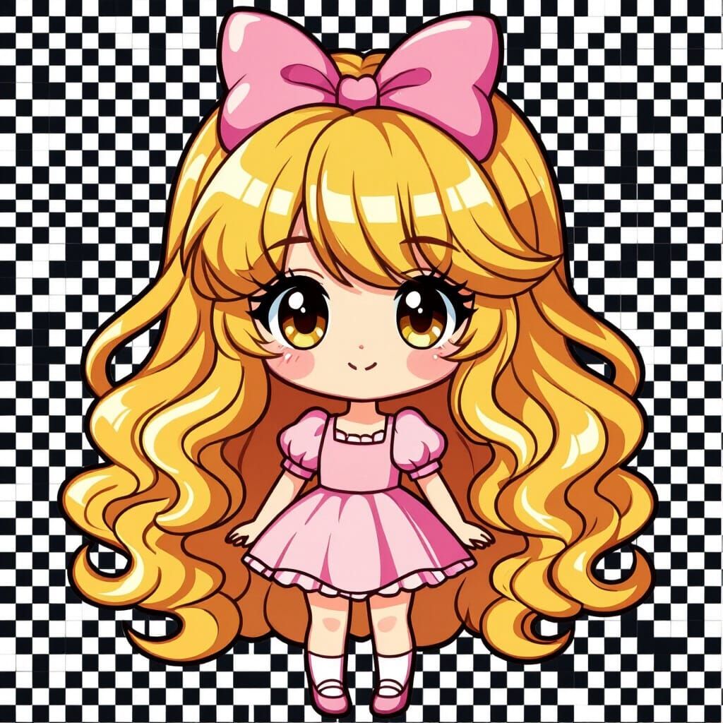 A digital sticker of a cute chibi girl with long golden hair obscuring her eyes, a pink bow, and a puff-sleeve dress. Features bold colors and thick outlines, reminiscent of retro 16-bit games.