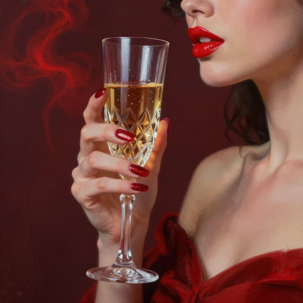 This image shows an elegant woman with red lips and nails raising a champagne glass, with a hint of her shoulder exposed. The background features red mist, rendered in an impasto gouache style with dynamic lighting.
