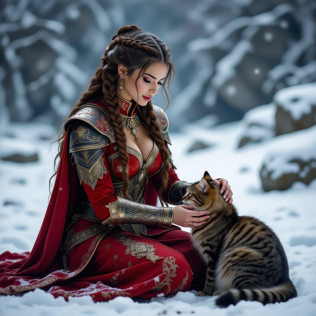 This image shows a hyperrealistic depiction of a beautiful warrior queen in intricate red armor, kneeling and petting her feline companion amidst a detailed snowy, rocky setting.