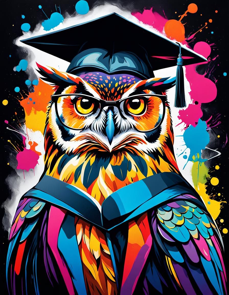 A vibrant image of an owl wearing a graduation cap and glasses. The owl gazes directly at the viewer against a backdrop of space and galaxies, rendered in a graffiti art style with vivid colors.