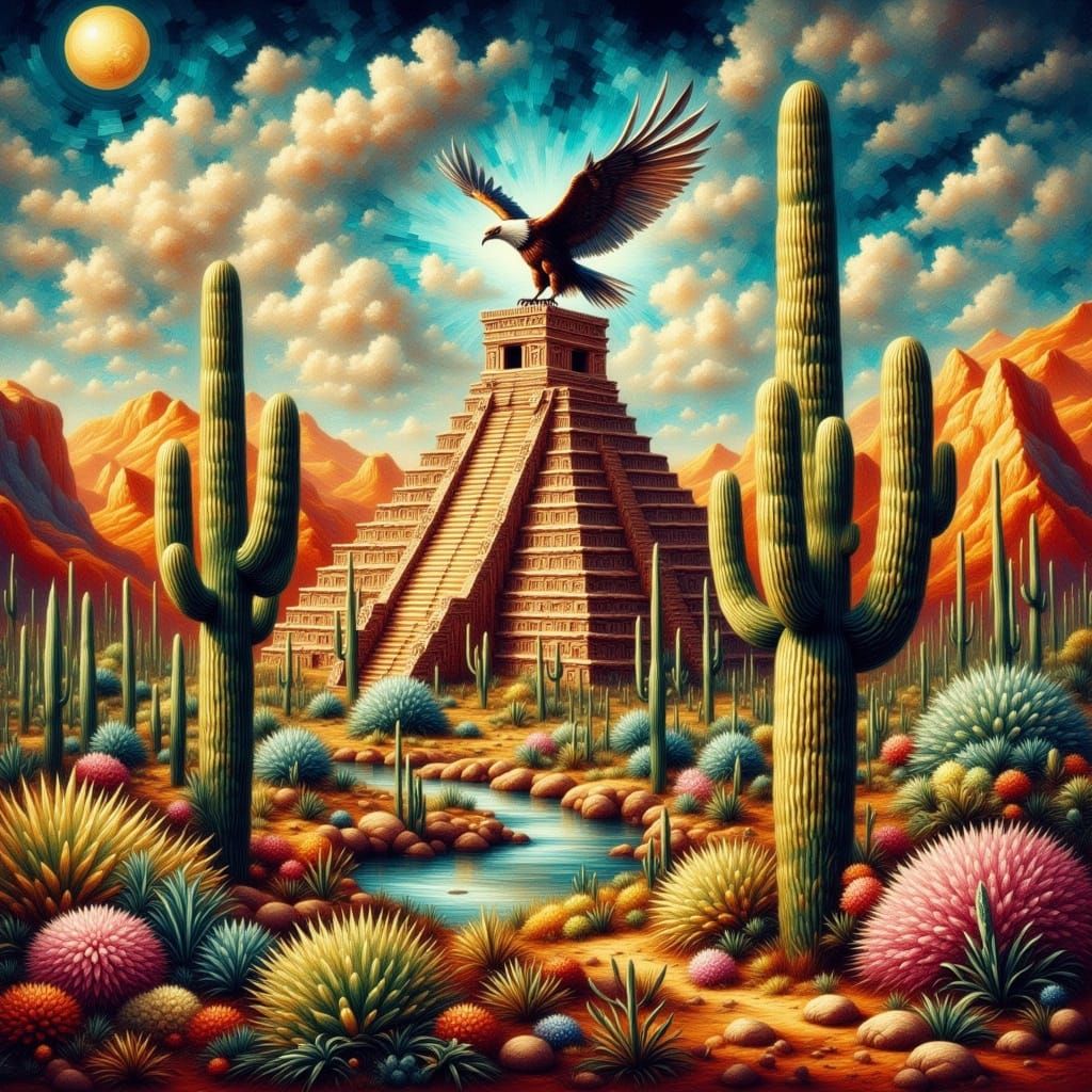 This image shows an Aztec temple in a desert landscape. An eagle sits on a saguaro cactus, all rendered with intricate detail in an antique watercolor style.