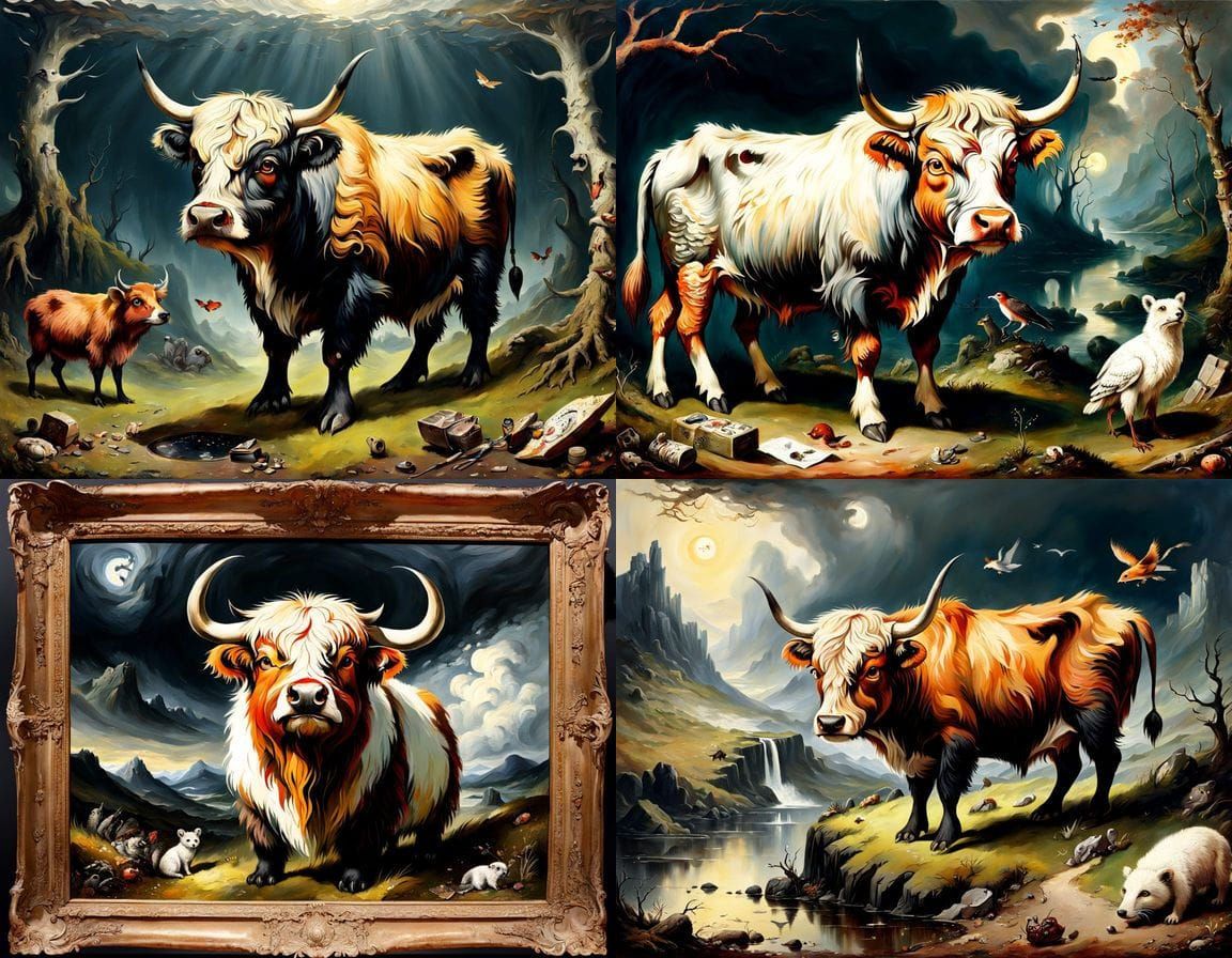 This haunting image captures a surreal, post-apocalyptic scene in the Scottish Highlands, featuring a mishmash of wildlife and organic forms, rendered in a dreamlike, Romantic aesthetic reminiscent of Turner's landscapes and the surrealist works of Dali and Tapies.