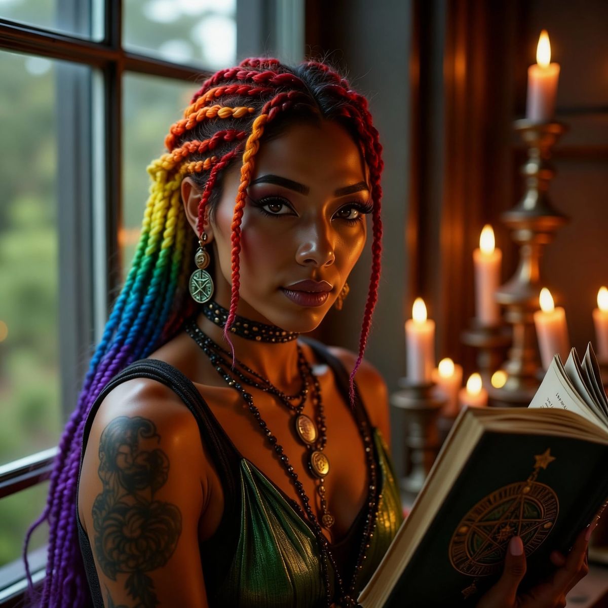 This image features a Hmong-African woman with long, rainbow-colored braids adorned with Wiccan charms, wearing gothic makeup and ornate jewelry against a gothic backdrop with rainbow-flamed candles.